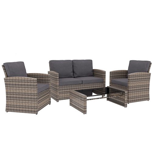 Salottino Da Giardino Salotto in Rattan Set Di Mobili 4 Posti con Tavolino Ripiano In Vetro Divano 2 Posti E 2 Poltrone Per Esterno Terrazzo Balcone Piscina Cuscini Sfoderabili Colore Marrone Chiaro